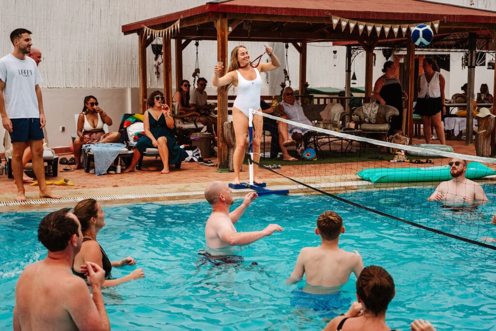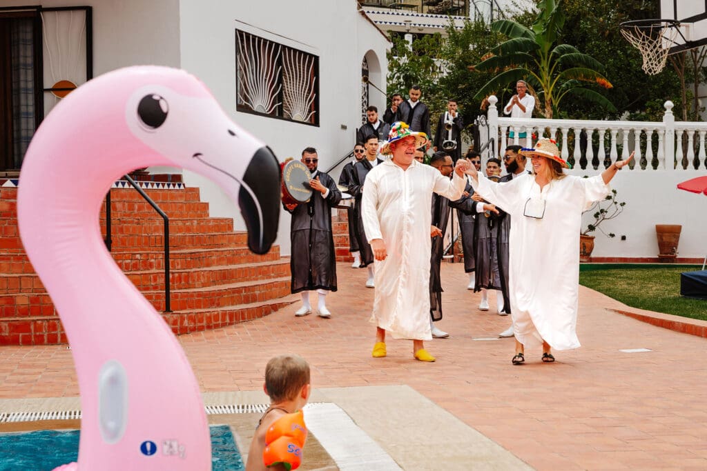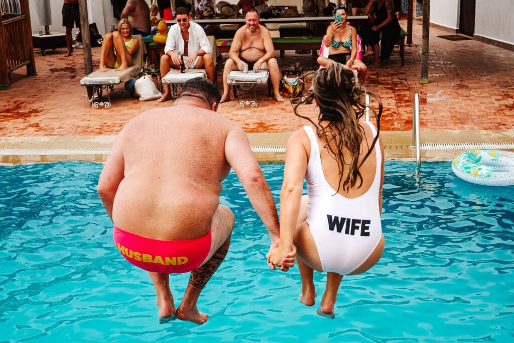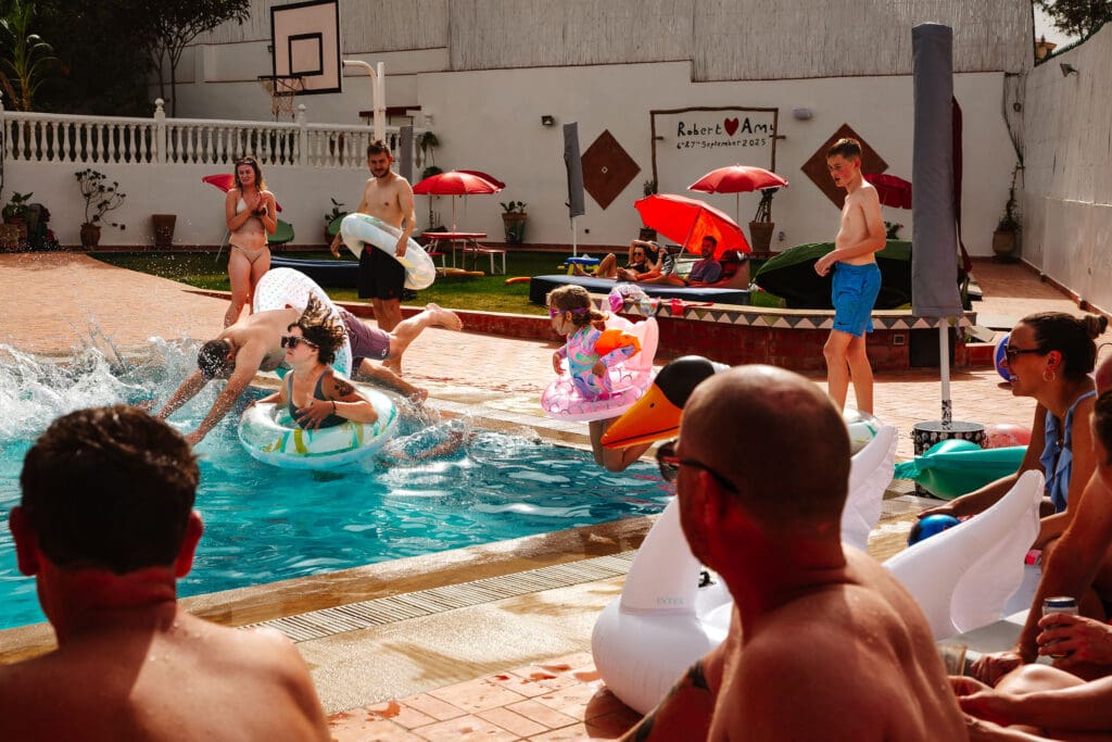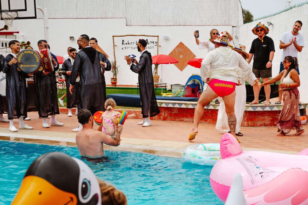 Day three was a pool party at the family villa, where the fun and crazy antics continued. The Hamid Chaka Band got everyone on their feet, and soon there were flamingos, rubber rings, and competitions happening all over the place. Rob and Amy wore their husband and wife swimwear and launched into the water in style!